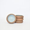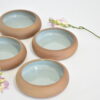 Es un Bowl esmaltado por dentro en color celeste jaspeado y crudo por fuera.